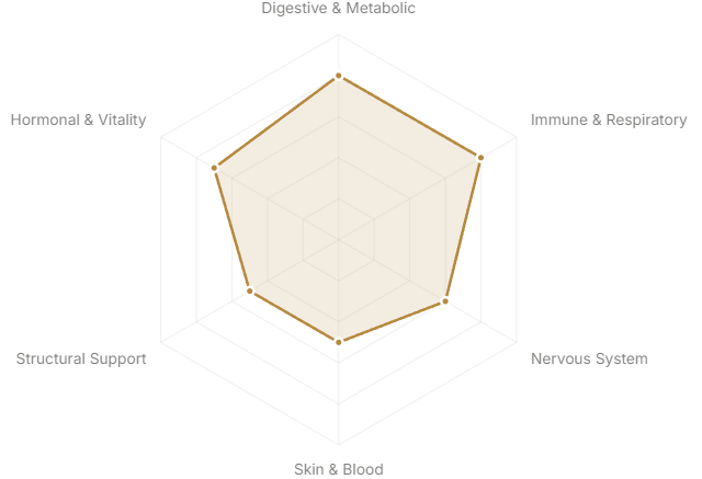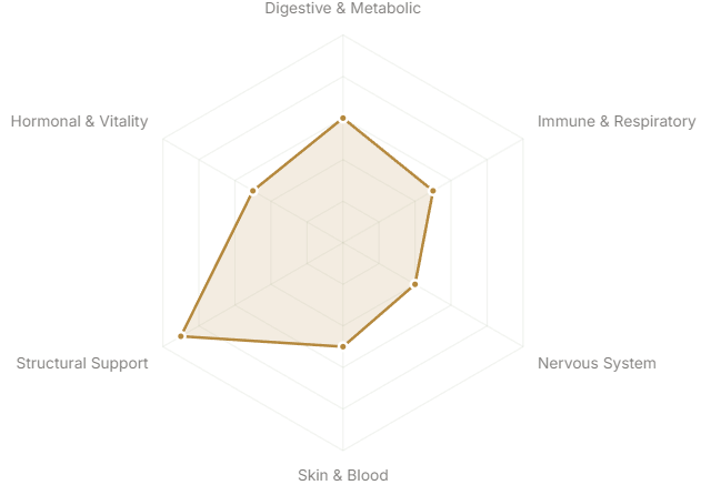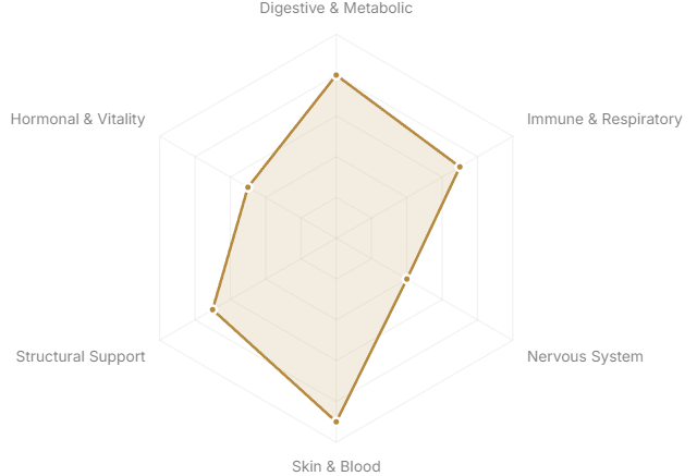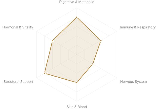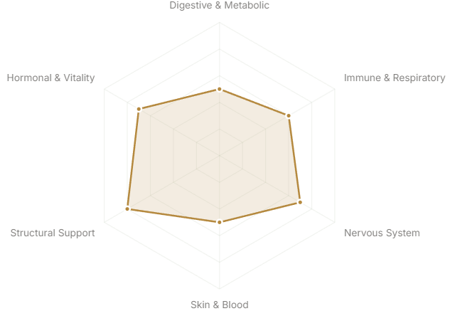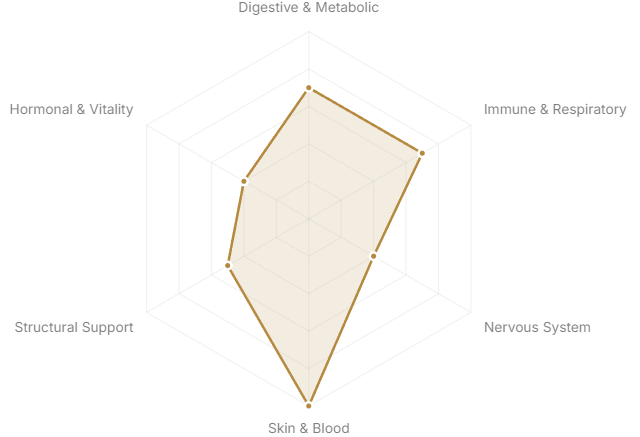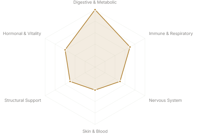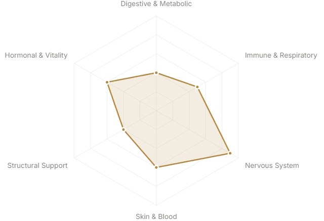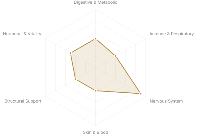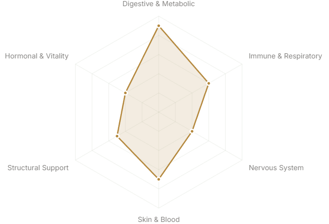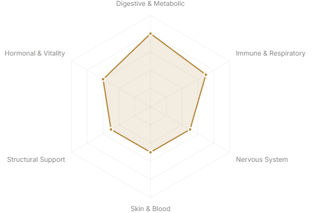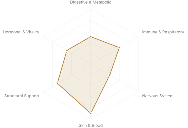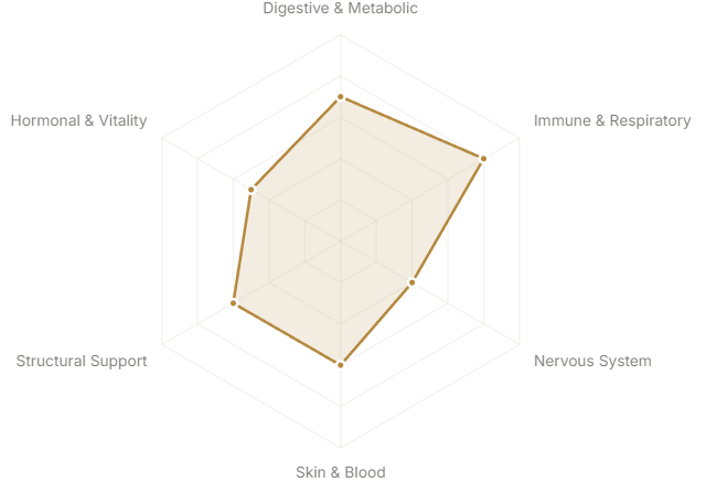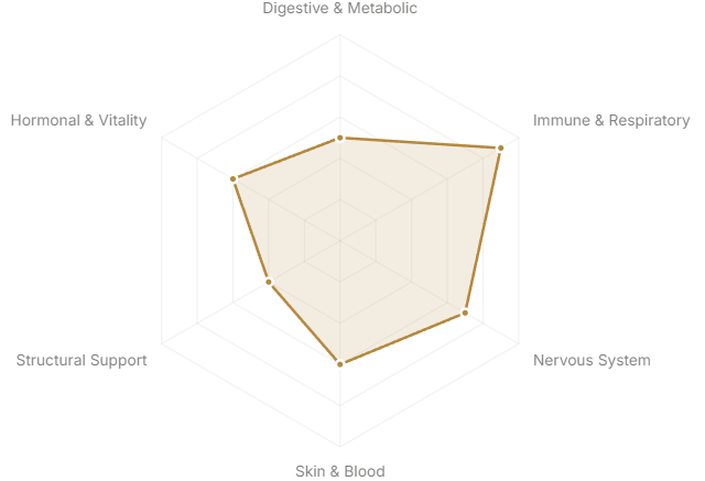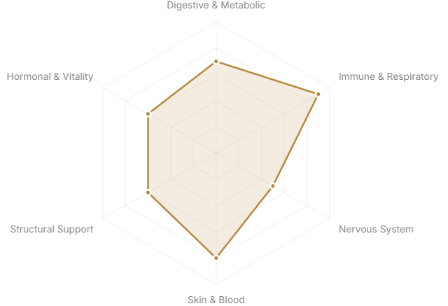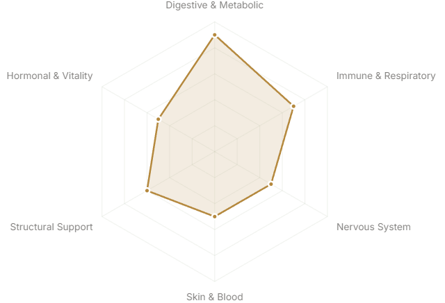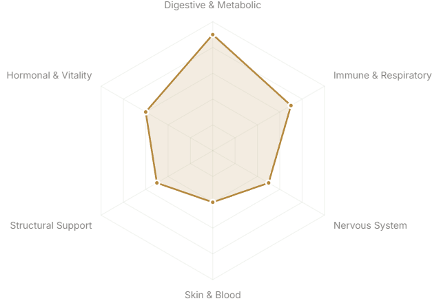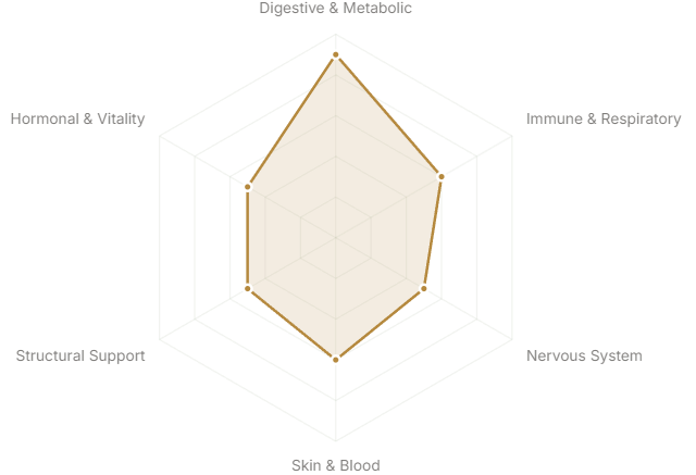 Each axis represents a major body system or therapeutic domain. The further from center, the stronger the botanical's traditional and clinical association with that system.